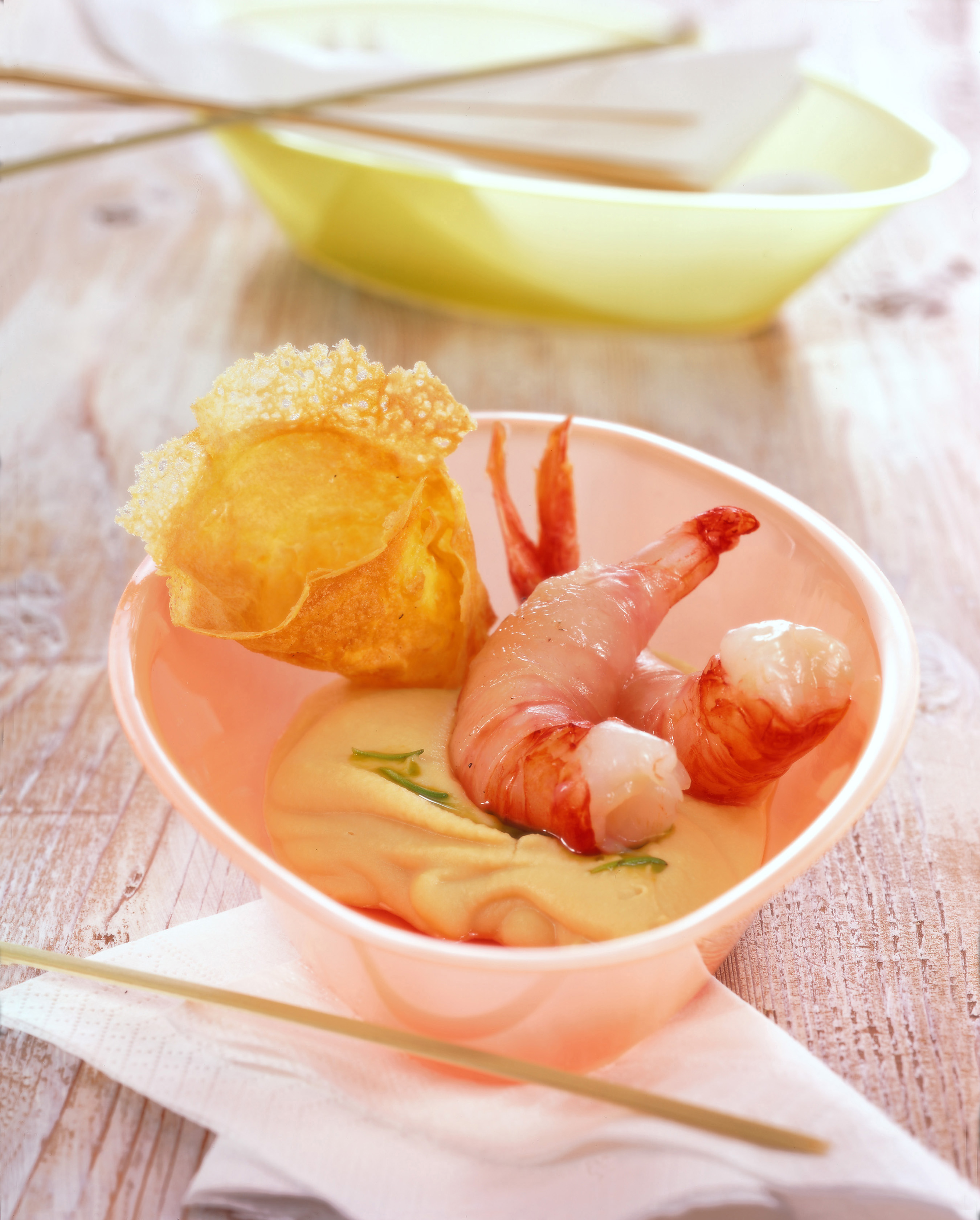 La passatina di ceci e gamberi di fulvio pierangelini. Ho apportato alcune modifiche non sostanziali alla ricetta rendendola più confacente alle mie necessità. Alla classica passatina di ceci con gamberi ho voluto aggiungere una nota croccante data dalle chips ed il retrogusto acidulo del passion fruit, spero vi piaccia ! Fate cuocere per 40 minuti se ceci secchi reidratati, 15 minuti per quelli in scatola. Alla passatina vanno aggiunti due cucchiai di olio extravergine d'oliva e sale. Cuocete le code di gambero per pochi minuti in una padella antiaderente con un filo d'olio e uno spicchio d'aglio, sfumando con il cointreau. Questa è la mia versione della celebre passatina di ceci e gamberi del famoso chef pierangelini. Alla purea di ceci unire un po' d'acqua di cottura e regolare di sale. È l'icona con cui fulvio pierangelini, grande solista della cucina italiana, è entrato nella storia. Passatina e chips di ceci con gamberi. Aggiungete i ceci e un rametto di rosmarino, bagnate con acqua calda e aggiustate di sale e pepe. Le varianti della passatina di ceci. Una volta cotti, togliete aglio e rosmarino e passateli con un frullatore ad immersione, aiutandovi con l'acqua di cottura.